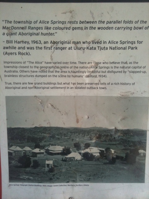 Alice Springs grundades som relästation för att binda samman telegraftrafiken mellan Adelaide och Darwin. Det gjorde att södra Australien fick direktaccess till övriga världen. Några missionärsstationer, tafatta försök till guldletande, boskapsfarmer och dragningen av järnvägen ”the Ghan” (ersatte de afghanska kamelerna) försökte öka befolkningsmängden men det var inte förren under andra världskriget när Darwin bombades och de fick flytta armehögkvarteret för Northern Territory hit som de började hända nåt. Därefter är det mest turismen som lockar med framförallt Uluru (Ayers rock) som är Australiens mest besökta naturattraktion. Även flertalet vackra vandringsleder finns tillgängliga i närheten till staden. Invånarantalet är idag drygt 20000.