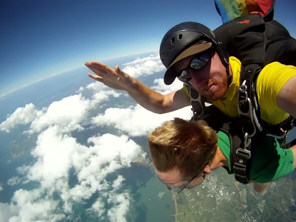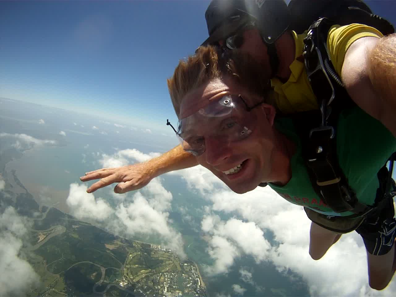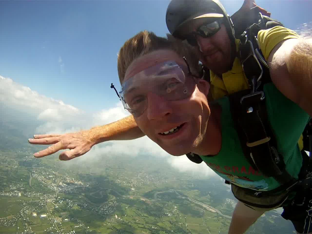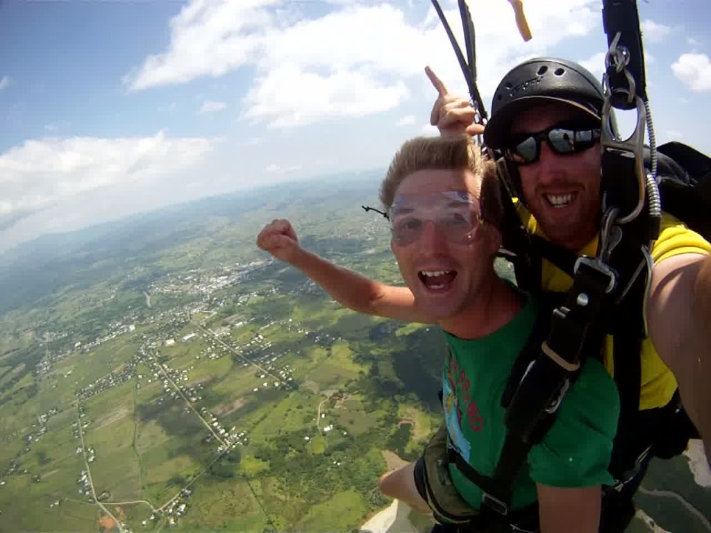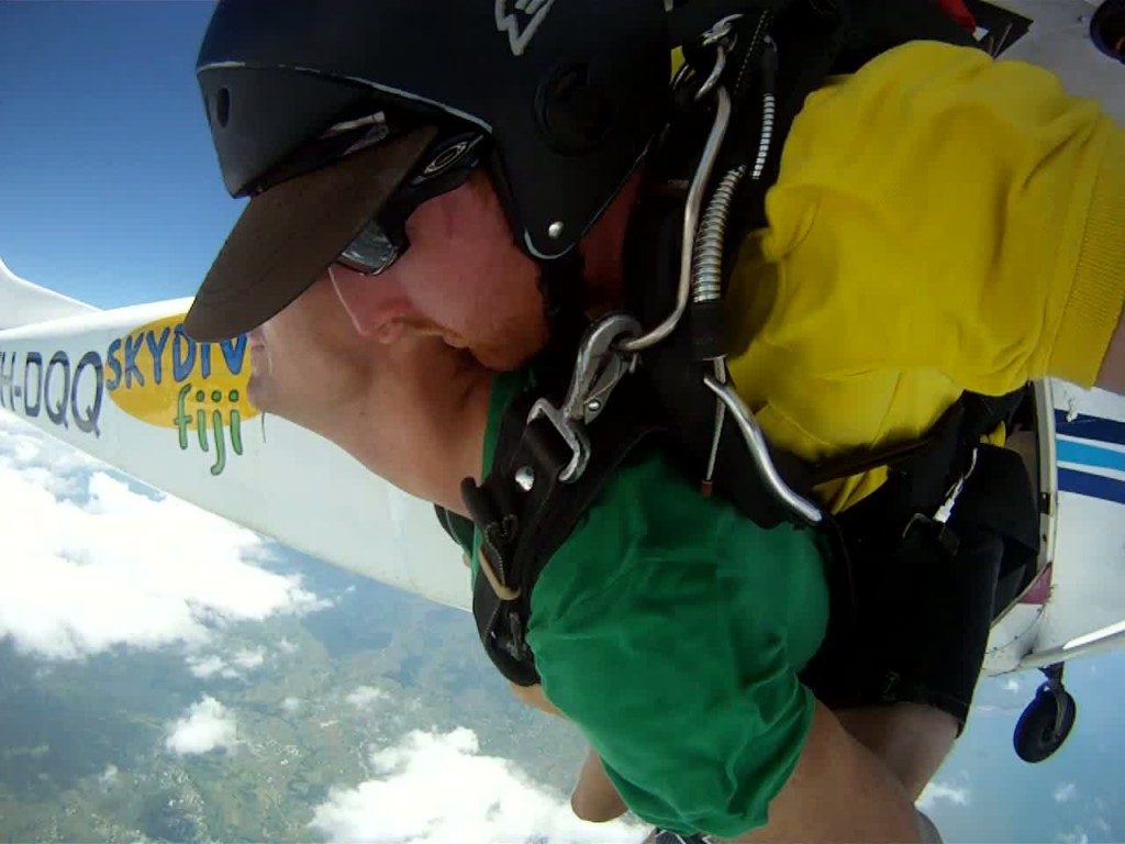Jag trodde jag skulle vara mera rädd och pirrig men flygresan uppåt var fantastisk med en nästan klar himmel över det Fijianska öriket. Makalöst vackert. Med Ian fastspänd på min rygg och försäkran om att han hade fallskärmen med sig och att jag satt fast i honom så la jag fötterna utanför flygplanet, intog den bananformade ställningen och blev utknuffad. Vi gjorde en volt och ena stunden såg jag marken och i andra himlen tills vi fick kontrollen och sträckte armarna utåt. Vi föll fritt halva distansen som varade i mer än 60 sekunder. Kinderna fladdrade i mitt breda glada flin. Sen kom rycket från fallskärmen och vi seglade sakta ner mot landningsplatsen. Hela vägen från det planet lättade marken till att jag var åter på havsnivå njöt jag. Vilken kick, vilken vacker omgivning och vilken häftig avslutning på mina fantastiska fyra månader!!! Yiiiihaaa!!! 🙂