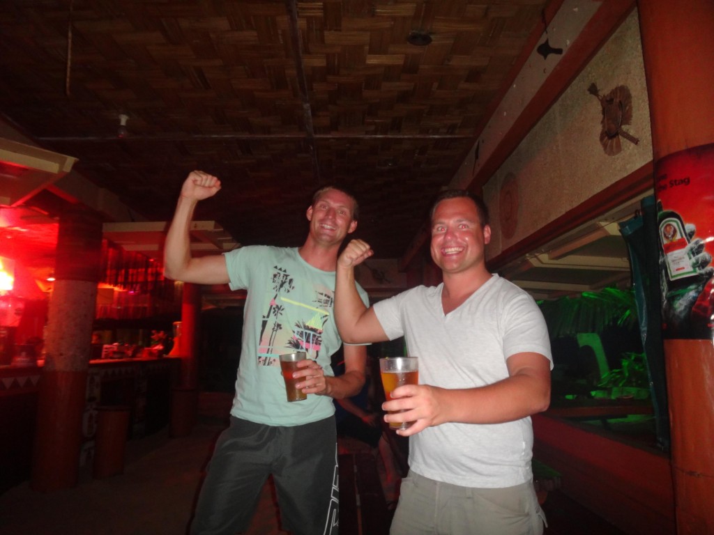 Väl i Beachcomber var det inte uppehåll. För att ta sig till och från öarna så kommer resorten ut och möter den stora båten med en mindre båt, utan tak… Nu ösregnade det. Folk klädde på sig regnkläder och försökte skyla sig bäst dom kunde. Jag och Johan gjorde tvärtom, vi tog av oss allt utom badshortsen. Beachcomber är känt för sitt party. Nu var det tyvärr inte så mycket folk men vi som var där lyckades ändå hålla igång stället fram till småtimmarna. Det blev några kannor av det Fijianska ölet Fiji bitter med sin slogan ”The sportsman beer”. Några meter från strandkanten var baren och dansgolvet var givetvis utav sand. Blev man trött och svettig av att dansa i sanden gick man ut på stranden och tog sig en dusch i hällregnet.