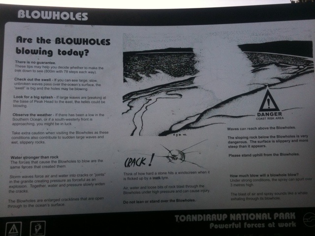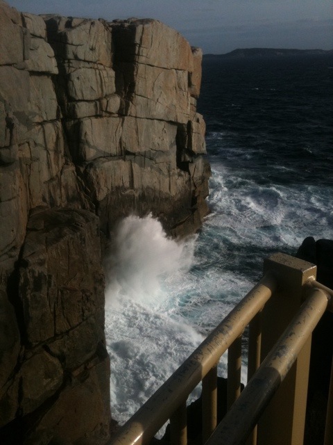 Vi fortsatte sen till the Blowholes. En liten promenad ner till kustlinjen och en skylt av att vi var på rätt plats. Men allt verkade lugnt förutom vågorna som rullade in i blåsten. Då plötsligt, mitt framför oss, hördes ett rytande vrål och en dimma av vatten blåste upp i ett spricka i klippan. Blåshålsmonstret! Vi satte oss och beskådade den vackra kusten samtidigt som vi med oregelbundna mellanrum blev skrämda av monstret i berget.
