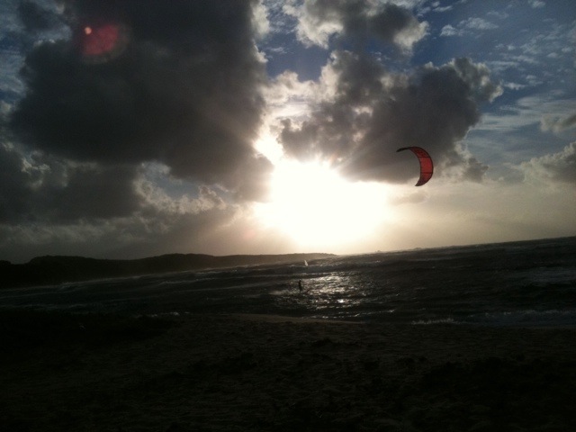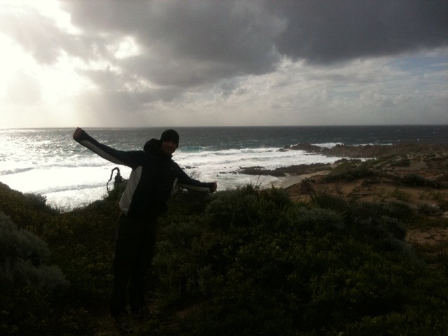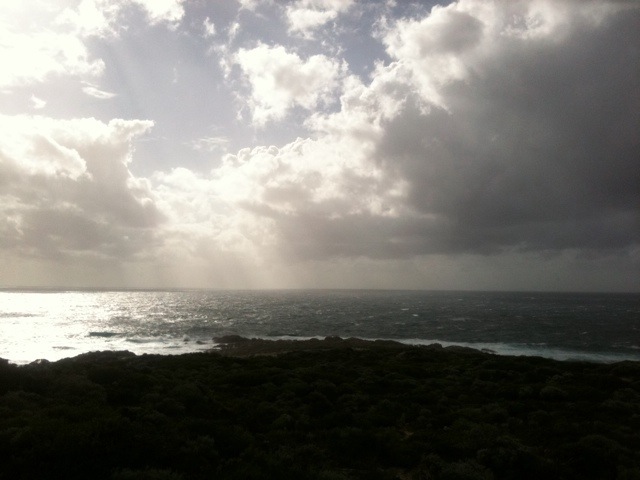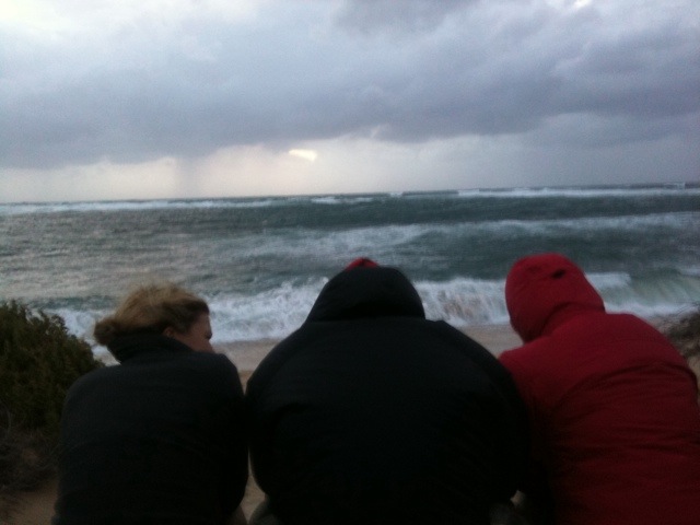 Första dagen avverkade jag och Mark mil, tjejerna ansluter först dagen därpå. Vi stannade i Myalup. Vädret var skräp med regn och blåst men vi tog ändå ett par öl ner till stranden. I snålblåsten tittade vi på blixtarna som slog ner i havet. Tills himmelen öppnade alla sprinklar. Det blev löpning tillbaka till husbilen.