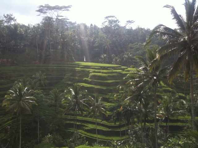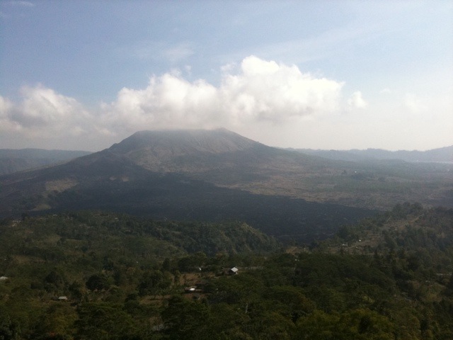 Surfing är ju en mkt stor del av Bali men igår fick jag även se hur merparten av Balineserna faktiskt lever. Blev upplockad av Bali Eco Bike Tours kl 07:30 (whohoo sovmorgon!) och tillsammans med sex andra turister körde minibussen upp oss mot bergen. Vi åt frukost (bananpannkakor och fruktbuffé) med en magnifik utsikt över den aktiva vulkanen Mt Batur och den högt belägna sjön nedanför (om aporna började springa nerför berget så var det läge att följa efter…).