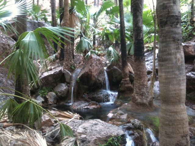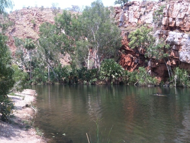 Idag blev det en badardag. Vi började i Zebedee springs som är en spricka i ett 1800 miljoner år gammalt berg där varmt vatten strömmar ut. I fåran växte höga palmer som gav skugga inte bara till oss utan även till små grodor, fjärilar och färggranna kakaduor. Vi lade oss i det rinnande vattnet och fick återigen en skön spakänsla.