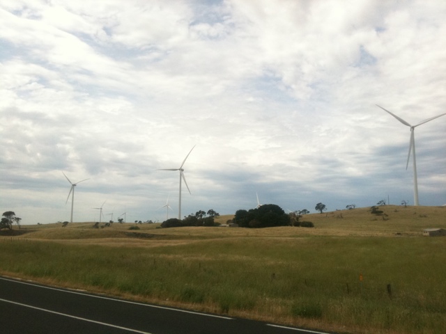 Vi lämnade Beachport och rullade utmed kusten till Mt Gambier. På vägen åkte vi förbi södra hemisfärens största vindkraftpark i Millicent. 136 vindkraftverk levererar en åttondel av South Australias all elektricitet. I Mt Gambier åkte vi förbi Blue lake som är en kratersjö. I November månad skiftar den färg från grå till gnistrande blå och skiftar sen under ett halvår så sakteliga tillbaka till grå. Därefter svängde vi av inåt landet och körde över gränsen till Victoria. Dags att dra fram klockan ytterliggare en halvtimme. Vädret varmt och kvavt, strax över 30 på termometern.