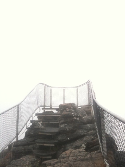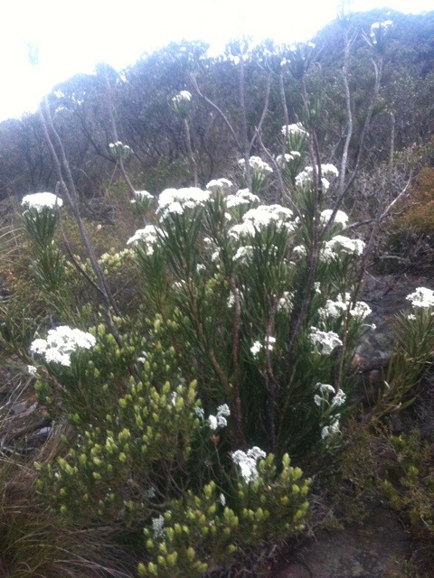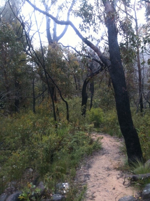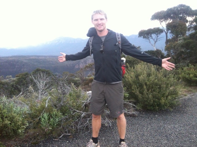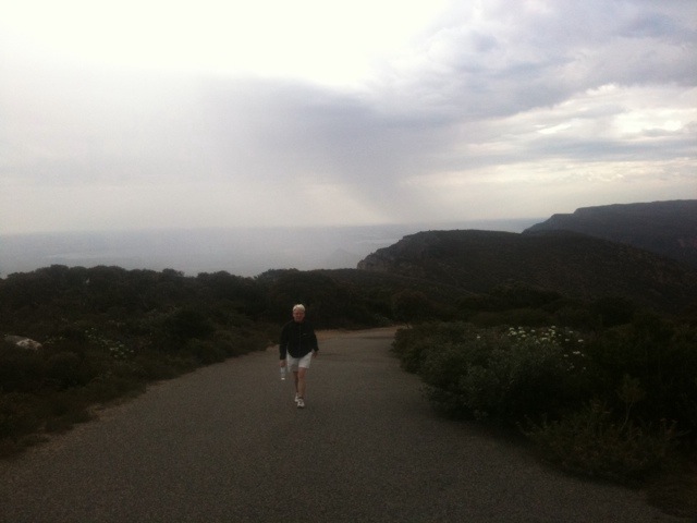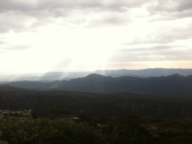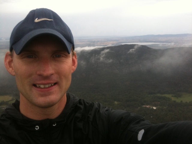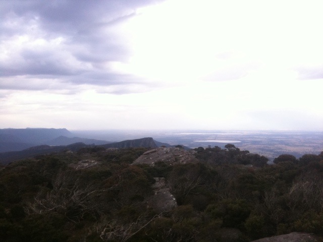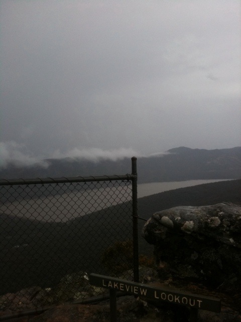 Jag bestämde mig för att knata vidare till Pinnacles lookout med hopp om att molnen skulle vara med mig. När jag kom fram till den uppbyggda utsiktsplatsen var allt jag kunde se ett stort fluffigt vitt moln. Attans. Jag bestämde mig för att ge det 10 minuter men när väl tiden var ute så tog jag kameran och fotograferade mig själv framför den molndränkta utsiktsplatsen. När jag granskar kortet ser jag att det spruckit upp bakom mig. Jag klättrade ut igen och fick tre minuter mellan två moln då jag kunde se ut över den magnifika dalen och se att jag var rätt högt upp även idag 🙂 Totalt blev det 5 kilometer. Regnkläderna åkte av och på i den blöta terrängen. Tyvärr var utsikten inte den bästa pga molnen men det var skönt att komma ut i terrängen och röra på mig. Väl värt en tidig uppstigning ändå.