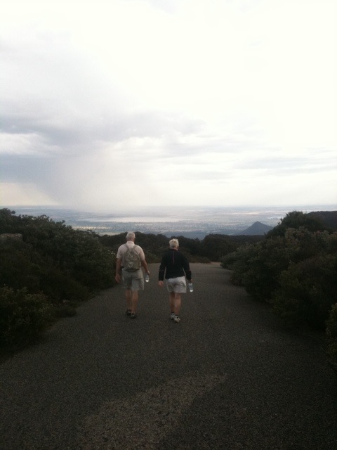 Därefter åkte vi mot Halls Gap. Vi hade fått tipset om Mt William, som är den högsta toppen i nationalparken, att man kunde köra upp nästan hela vägen till toppen. Så vi tog sats uppför en slingrig väg. Vägen gick hela vägen upp till toppen men en bom satte stopp för bilen så vi hoppade ur och började gå sista biten. Vi tänkte att vi kunde väl vända om vi får fin utsikt, behöver inte gå hela vägen. Det började dessutom bli sent på dagen. Första 500m gick rakt uppför en av de brantaste asfaltsvägarna jag någonsin gått. Sen började vägen slingra sig igen. Nyfikna vad som var efter nästa krök fortsatte vi. Brant som tusan men ju längre vi gick desto mer hägrade målet att nå toppen. Vädret var grått men sikten ändå klar. Rejäla vindpustar och kyligt men vad gjorde det när vi kunde se en makalös vy över hela Grampians från toppen som är 1167m hög. Och en telestation! 2km uppför, visserligen på asfalt, men ändock rejält kämpigt. Och sen nedför. Benen fick jobba 🙂
