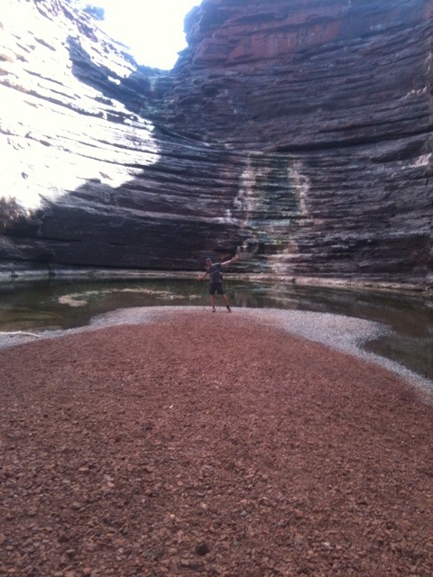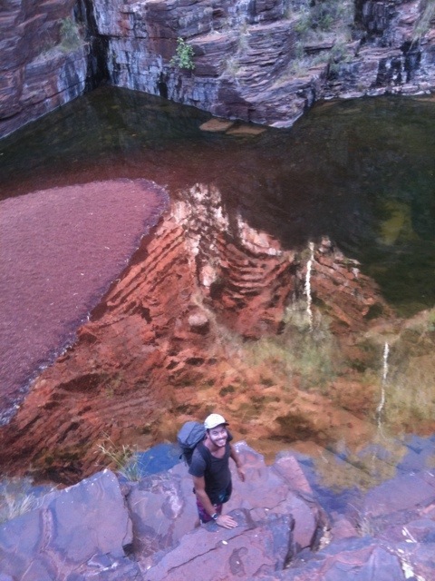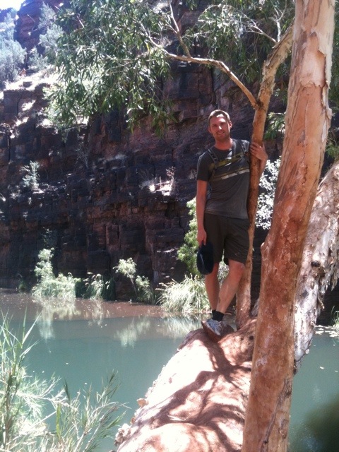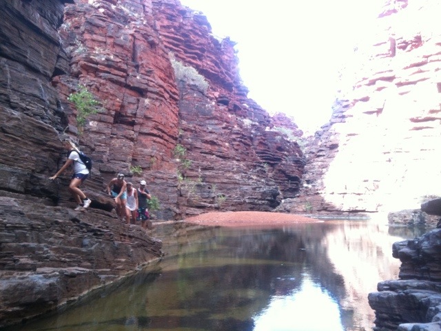 När vi kom tillbaka till campen var det fortfarande några timmar sol kvar. Vi fick tipset om att knata ner till Joffrey Gorge där vi kunde svalka oss. Nio av oss klättrade ner för den klass 5 klassade leden (svåraste man får gå utan rep och guide), ca 40m branta hala klippor med små utsprång som man kunde sätta fötterna på. Väl nere blev det ett antal ”Kodak moments” innan hälften av oss tog på oss badkläderna och hoppade i vattnet och simmade mellan de branta klippväggarna. Vi simmade i en kvart in i klyftan innan vi kom fram till land där vi kunde klättra upp i ett mjukt pappersträd och titta ner vart vattnet fortsatte. Sen tillbaka samma väg. Lugnt och stilla utforskande vad Joffrey Gorge hade att erbjuda.