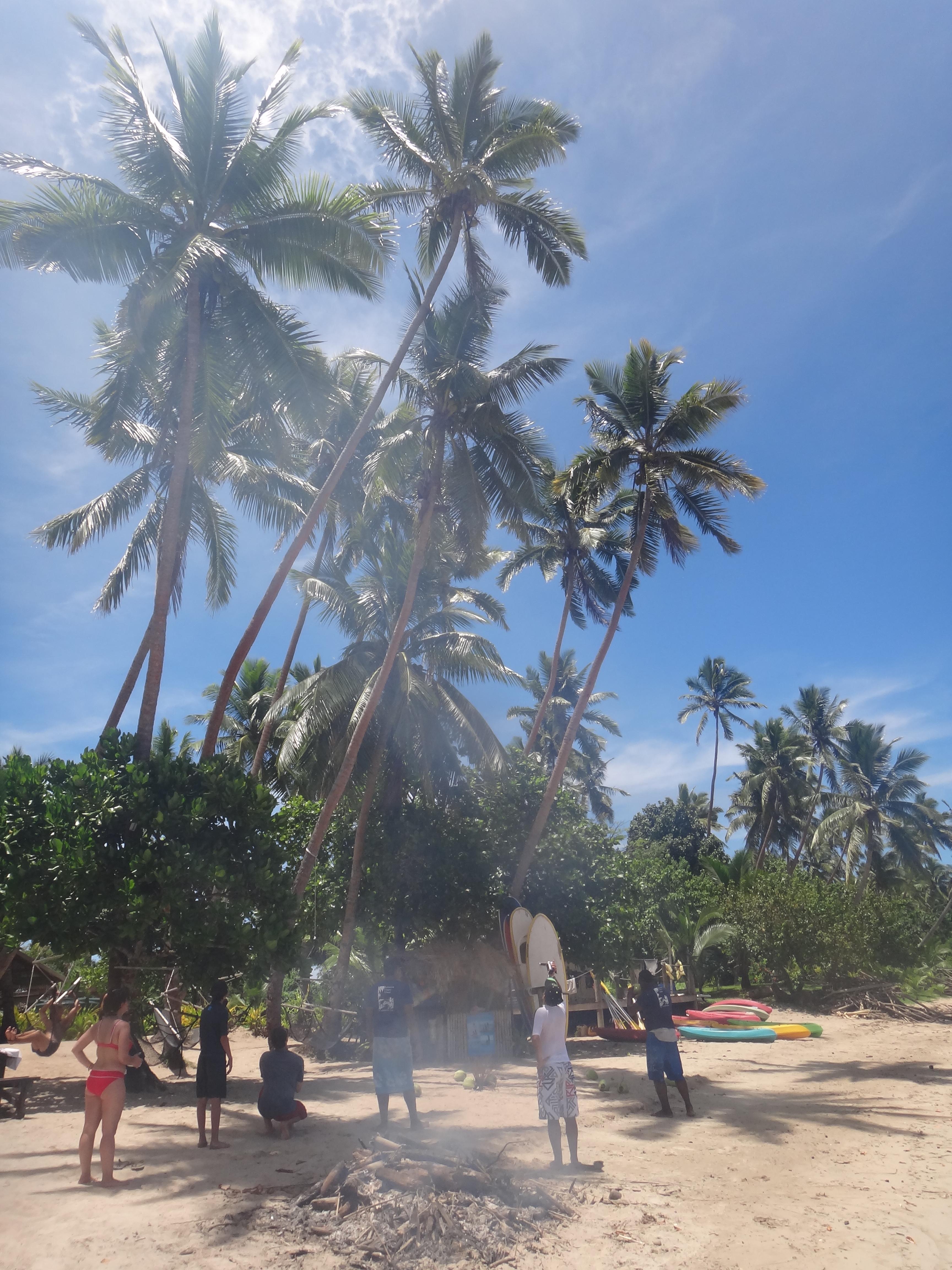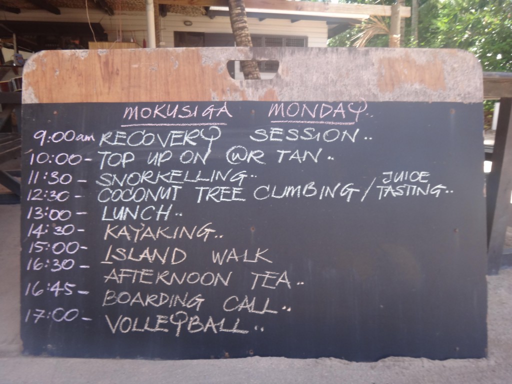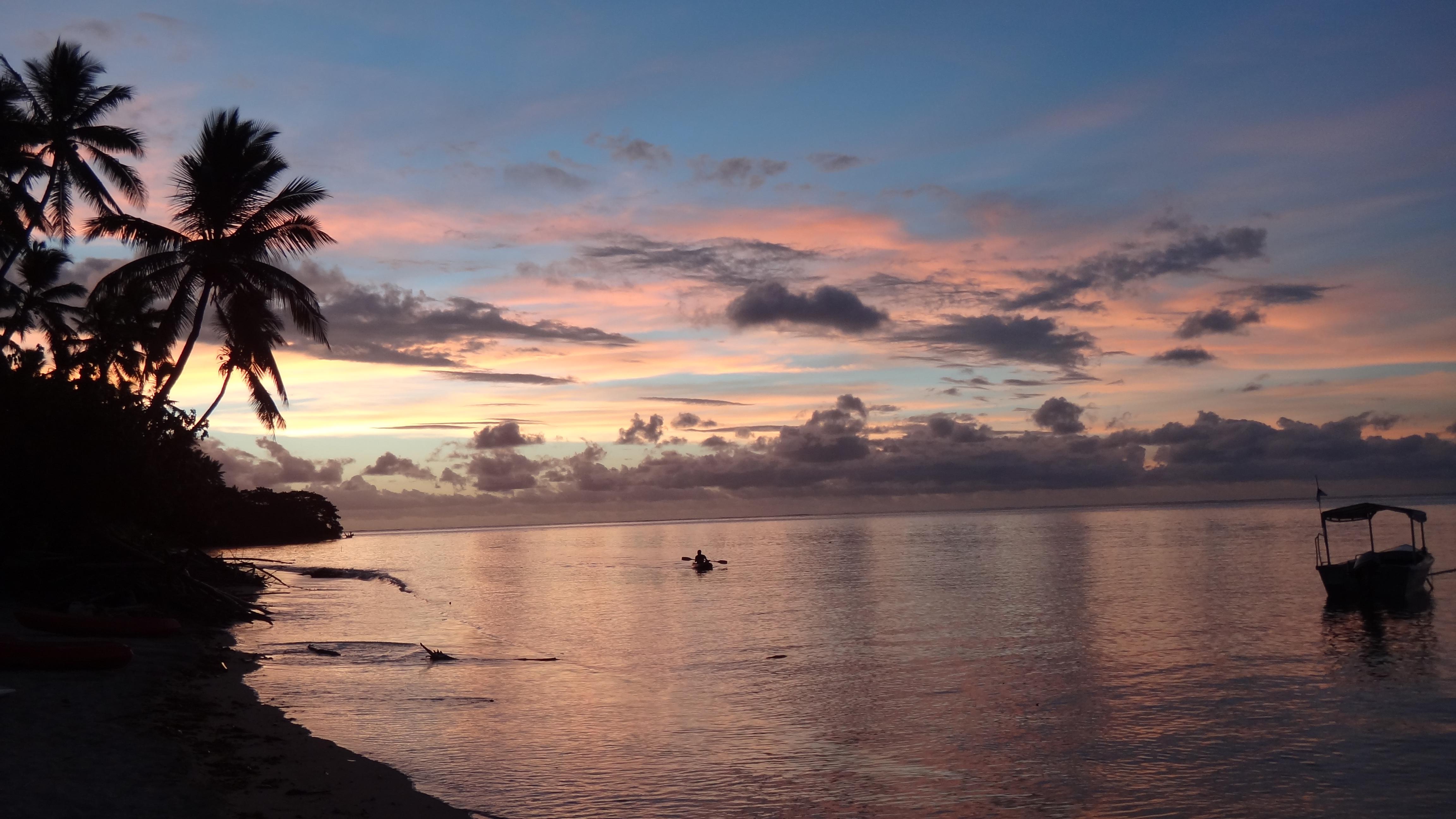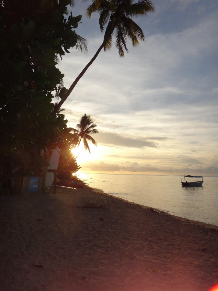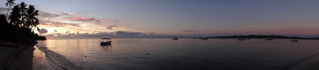 Eftermiddagen fördrevs med läsande, en kajaktur runt ön och sen en hård match i volleyball. Volleyball är seriöst i detta land även om det inte är långt till skratten. Fijianerna är riktigt duktiga, inte bara på denna ön, och det visade sig att en utav dom (som tur var i mitt lag) spelat i landslaget. Misstänker att motståndarna fått för mycket kava igår, så gick snacket iaf. Kul och svettigt var det och innan middag, solnedgång och kavaceremonin fick det bli ett dopp i poolen. Och innan läggdags en månskenspromenad på stranden med ljumma vindar i ansiktet. Såg stora krabbhål i sanden och hörde rasslande i skogskanten. Inte den coola klovarianten denna gången, stora rackare men fortfarande snabba. Det blev snabba ben för mig också upp till min lilla bure som jag nu ska sova gott i. God natt!