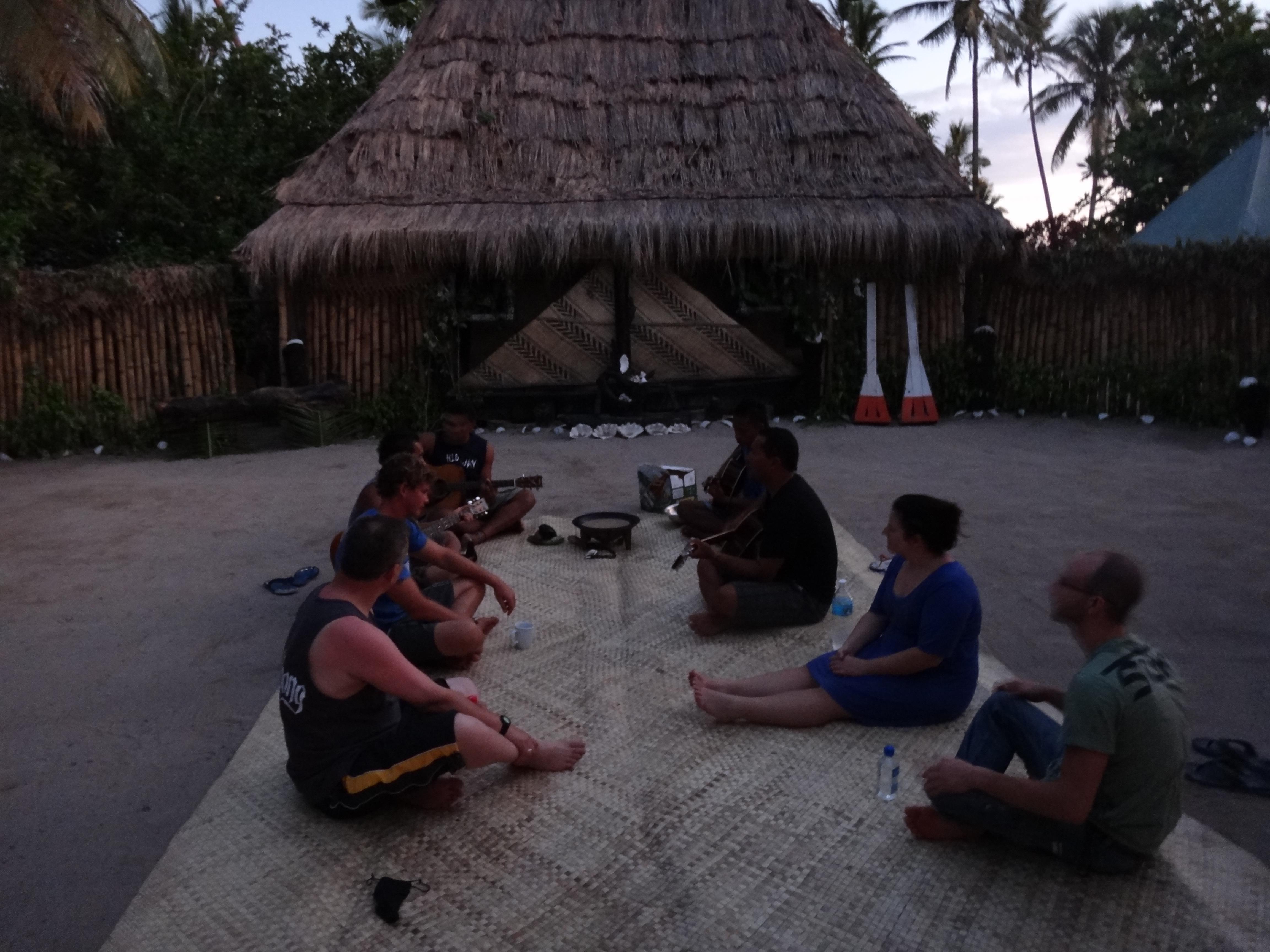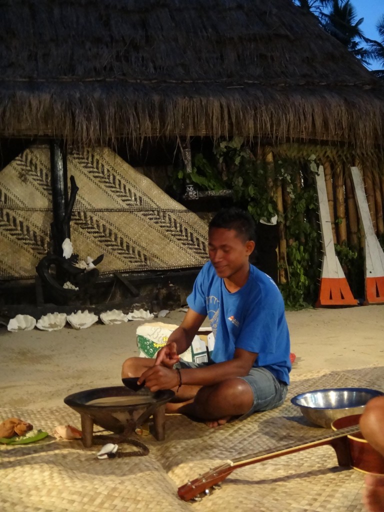 Kava har varit på tapeten senaste tiden och ikväll har jag introducerats i kavaceremonin. Kava är en dryck som baseras på rötter som de låter växa i sex till åtta år innan de tvättas och mals och sedan blandas med vatten. Första gången jag stötte på det var på Beachcomber sent på natten. Jag trodde Johan skämtade med mig när jag fick dricka ur en plastbalja där det dessutom låg ett tygstycke. Det smakade diskvatten och jag var övertygad om att så var fallet. Men icke, det smakade likadant idag, trasan används för att mala rötterna. Kavaceremonin vi försökte efterlikna var den mellan byhövdingar, förmodligen kannibaler. Två hövdingar och deras talespersoner (hövdingarna kunde vara gamla och skröpliga och sitta på långt avstånd så en yngre talesperson med stark röst användes) bjöds på kava och den som skulle dricka utförde följande: en klapp, ropa ”bula”, dricka upp kavan ur en skål av kokosnöt, tre klapp och säga ”maca” (uttalas matha). Sedan var det nästa på tur.