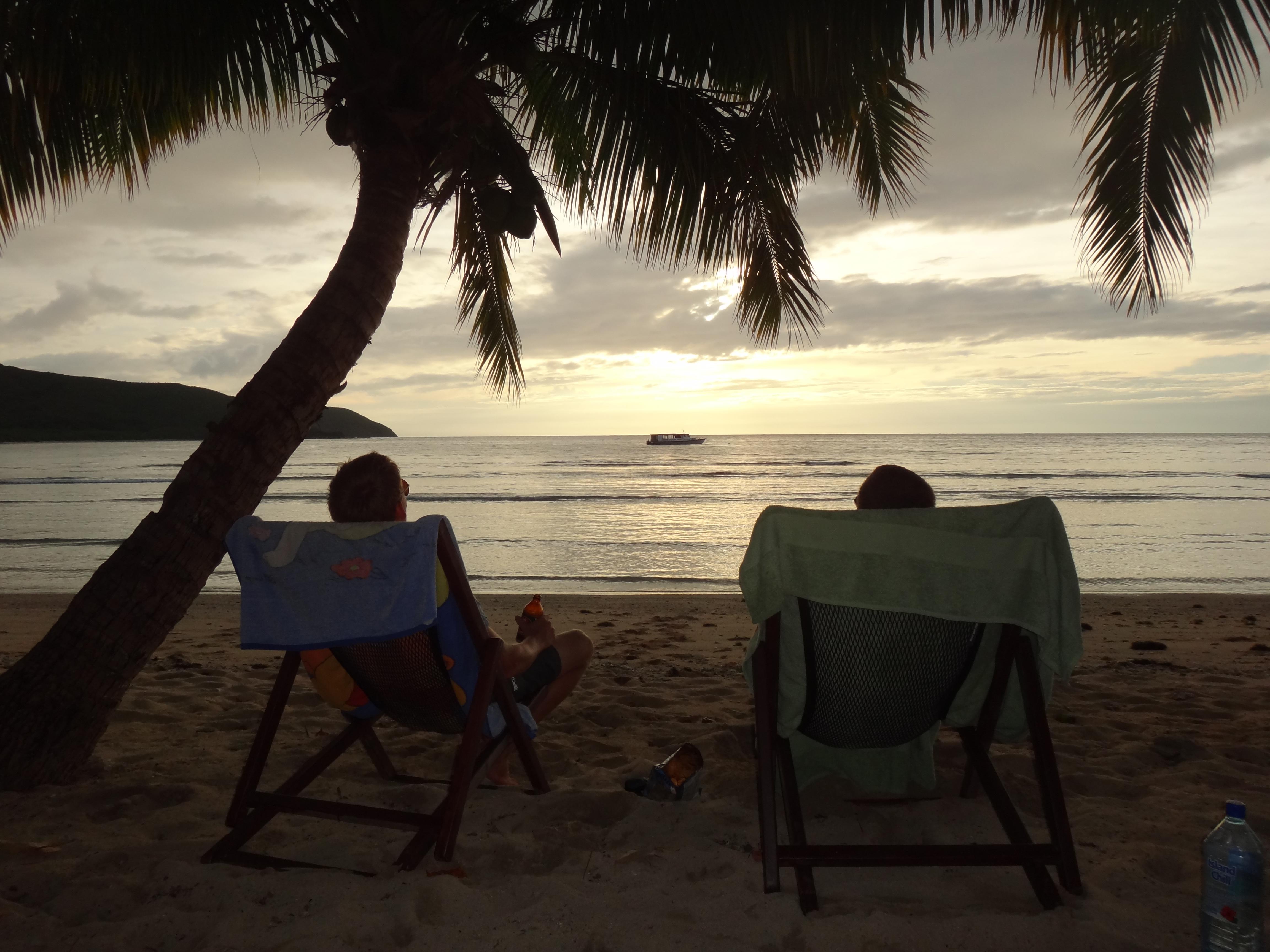 Efter tre nätter på Korovou är vi nu på Kuata. Korovou bjöd på trevliga människor, krabbor på stranden, fin snorkling vid Honeymoon beach helt ensamma, strandlöpning, havssimning, dansuppvisning, Fiji-öl och islängningar i poolen. Det där med poolen var nåt de gjorde för att fira nytt år och det höll i sig. Turister slängde i personalen, personalen slängde i turisterna, det vart lite livat emellanåt men alltid med en massa skratt. Efter middagarna körde personalen bula dance. En fånig variant av hemmasnickrad koreografi men de såg ut att ha roligt så vi skrattade gott tillsammans. Sen skulle givetvis turisterna få vara med. I övrigt då? Plöjde igenom Drakflygaren på tre dar i hängmattan.