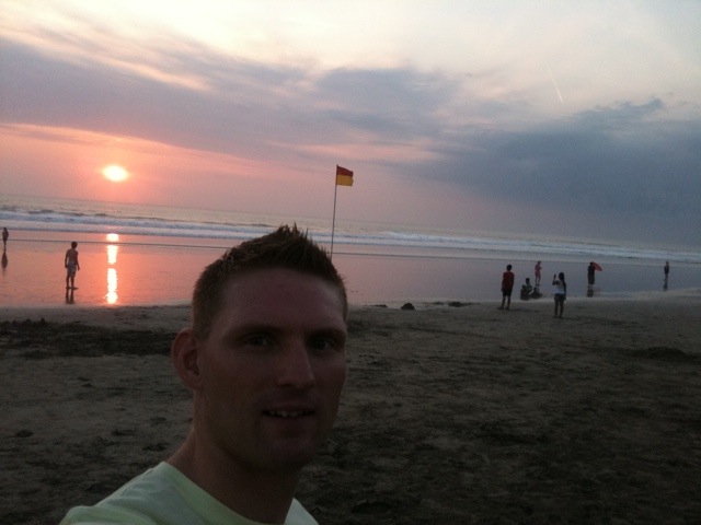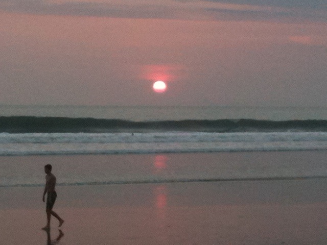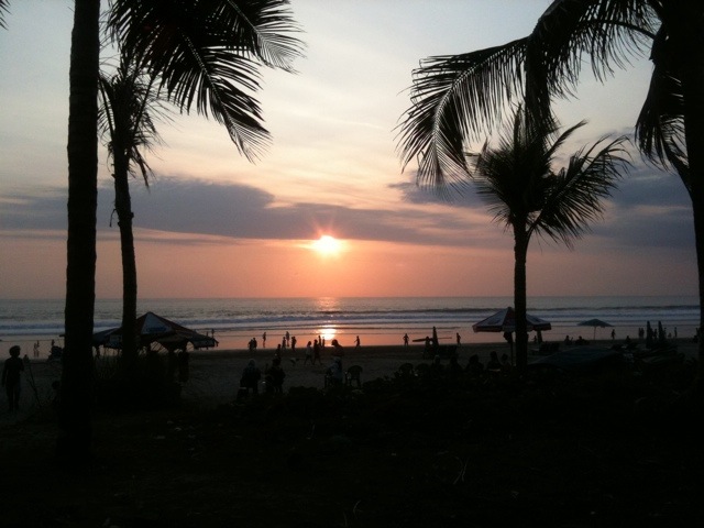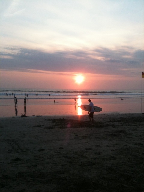 Framåt solnedgångstid tog jag mig ner till stranden. Fick återigen uppleva en magiskt vacker sol som snabbt sjönk ned i havet och direkt därefter levererade en sval kvällsbris. Legian beach är en stor långsträckt sandstrand strax norr om Kuta. Utmed löper stora beach resorts och på stränderna patrullerar badvakterna för att rädda turister i nöd. Surfingen är god och består av beach breaks. Mängder av stånd på stranden levererar öl och annan dryck till strandhängande turister och ungarna spelar fotboll eller bygger sandslott. Kontraster till mitt morgonsim i morse då jag var nästan helt själv på en kritvit sandstrand. Och restaurangen jag nu sitter på överröstas av trafiken på gatan. Kontraster som sagt men staden har sin charm den också även om jag föredrar vågornas brus som ljudkuliss.