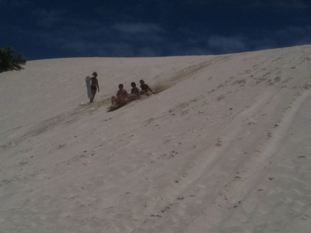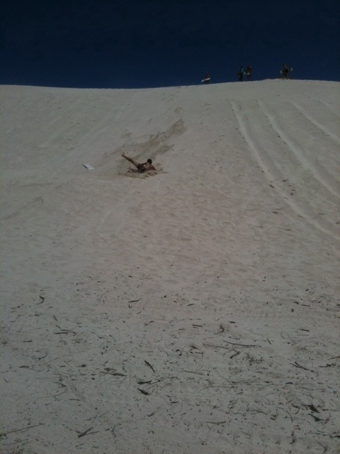 Vi började dagen med en fyra timmars resa ner till Sandy Cape. Där plockade vi ut surfingbrädorna, sandsurfingbrädorna ska tilläggas, och gick ner till sanddynerna. Med huvudet efter, före och uppåt åkte vi bräda nerför sanden. Hur kul som helst. Många garv blev det när var och varannan trillade runt och fick sig en rejäl blästring av sanden 🙂