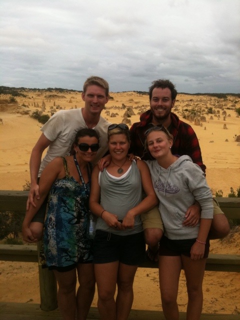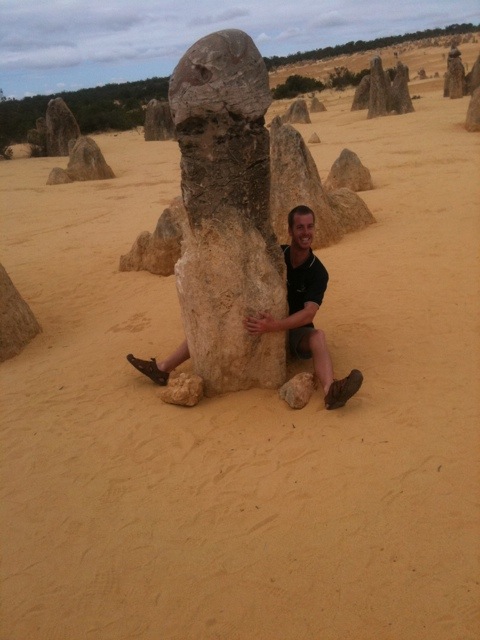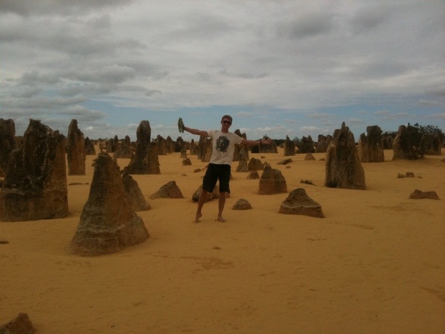Efter ett bad i det turkosa vattnet och en lunch rullade vi vidare mot Pinnacles. Från att fått vår kläder rödfärgade av dammet vid Karajini lade vi nu till lite gul färg. Pinnacles består av en knallgul sandöken med rakt uppstående stenar. Visst fnitter uppstod av de mest penisliknande stenarna men det byttes snart ut till kreativt fotande av den mer absurda sorten. Platsen är väl värd ett besök för dess unika miljö.
