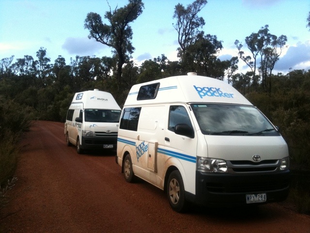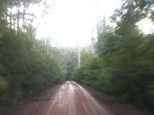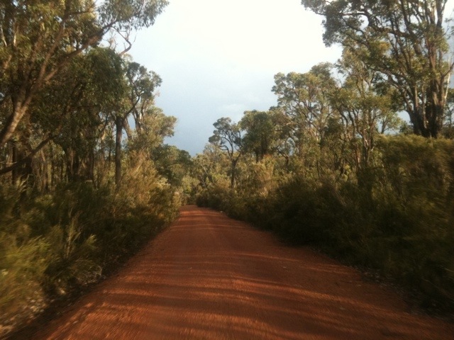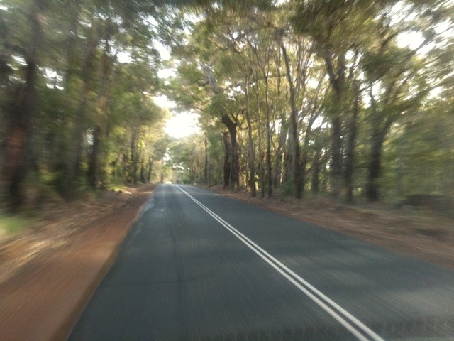 På vägen ner mot nattens läger i Walpole tog vi en sidotur genom den vackra skogen och skvätte ner våra campervans med rödfärgad jord. Väl ute på ”motorvägen” fick vi 110km/h fart igen. Rak men smal väg med feta träd bara halvmetern från vägkanten. Vid campingen mötte vi kängurur. Man får se till att vara försiktig på de australiska vägarna…