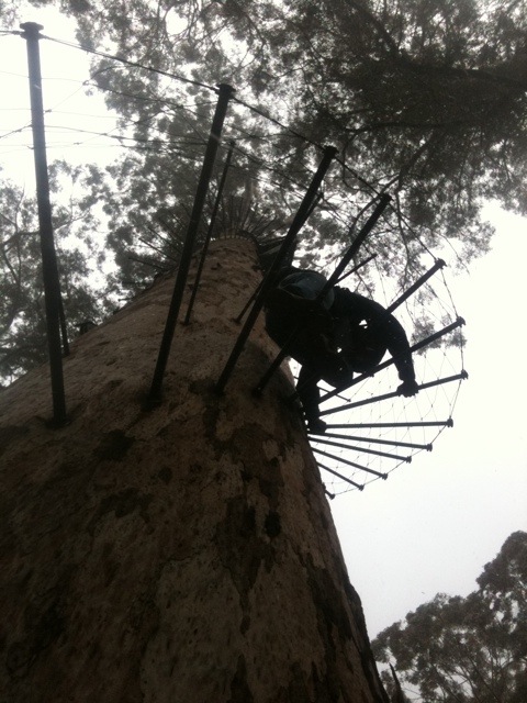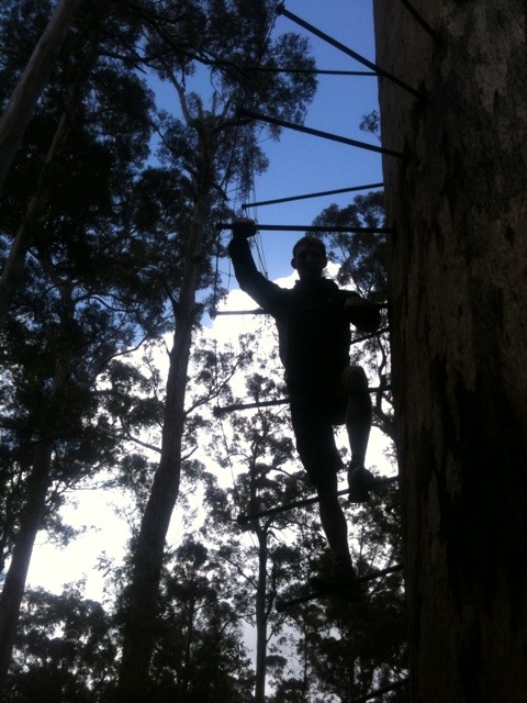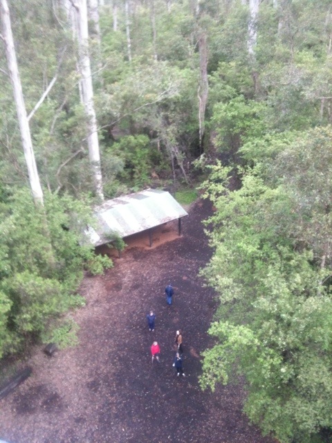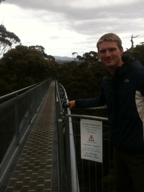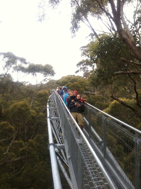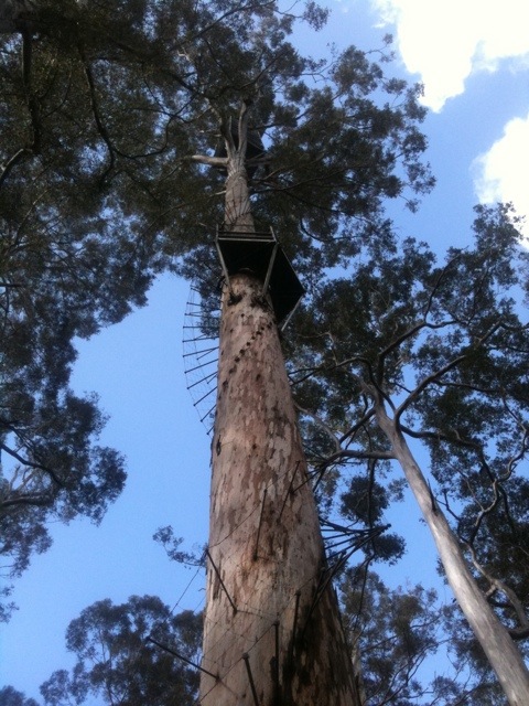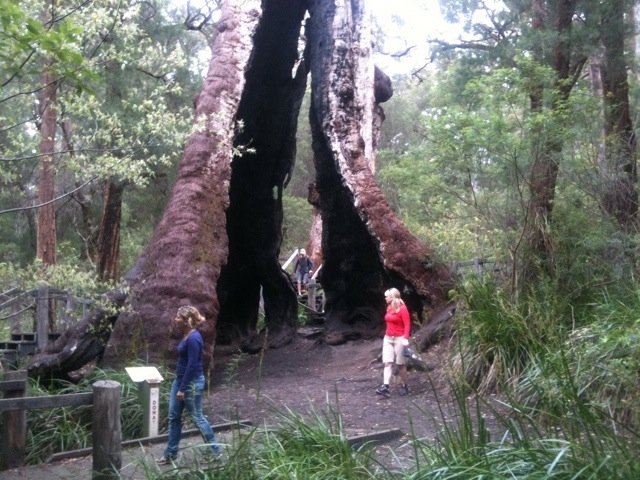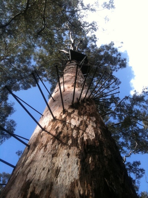 Vi åkte därefter vidare mot storskogen. Vi tittade på gigantiska jarrah-, tingle och karriträd. Efter lunchen i Pemberton åkte vi till Bicentennial tree. Ett jätteträd som användes som brandtorn en gång i tiden. I stammen är halvmeterlånga järnspikar fastkilade och de slingrar sig hela vägen upp till den 75m höga toppen. Claudia kom 8m innan hon backade ur. Jag och Anna kom till den första plattformen på 25m sen kliades det för mkt i mina fötter för att jag skulle våga mig högre. Livet är för bra just nu… Mark däremot tog sig hela vägen till toppen trots regn och blåst på vägen. (Så statistiken att bara 1 av 4 turister vågar sig hela vägen stämmer.)